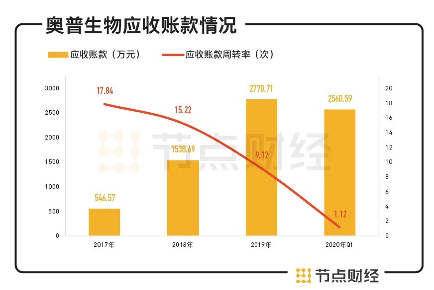 2017年末、2018 年末、2019 年末和2020 年3月末,奥普生物的应收账款账面余额分别为 546.57万元、1538.69 万元、2770.71万元和2560.59 万元,占营业收入比例为4.14%、9.7%、14.1%和85.53%,规模不断膨胀且占比提升迅猛,而应收账款周转率逐年下滑。