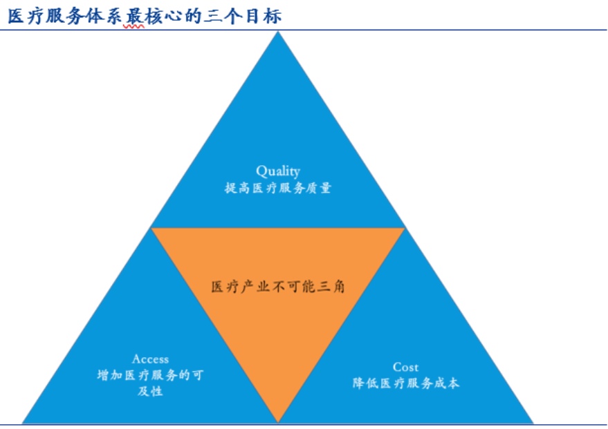 美国耶鲁大学教授William Kissick在著作《医疗的困境:无限需求和有限资源》中提出了传统医疗体系著名的不可能三角,其基本观点是在给定约束条件下,一个国家的医疗系统很难同时兼顾“提高医疗服务质量、增加医疗服务可及性和降低医疗服务的价格”。