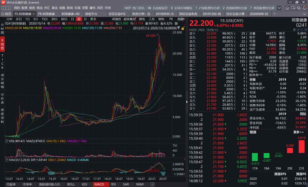 图:阿里健康高高的股价,来源自wind金融终端。