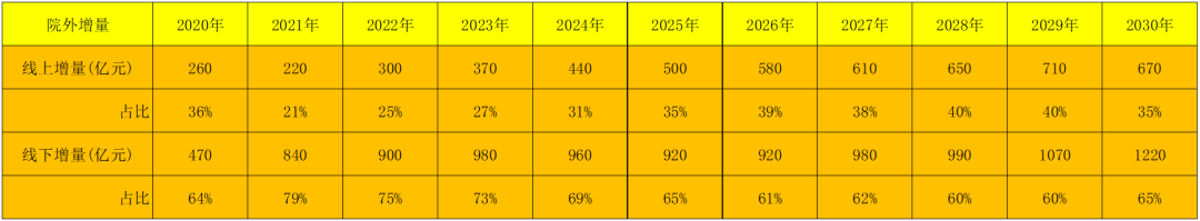 根据产业链调研,进一步假设,医院销售的口服制剂中约有30%的比例成功由院内销售向院外销售转换,则医药分开有望形成千亿级别的院外处方药市场,而这部分的院外处方药将由线下零售药店、医药电商或者基层社区医院来承接。