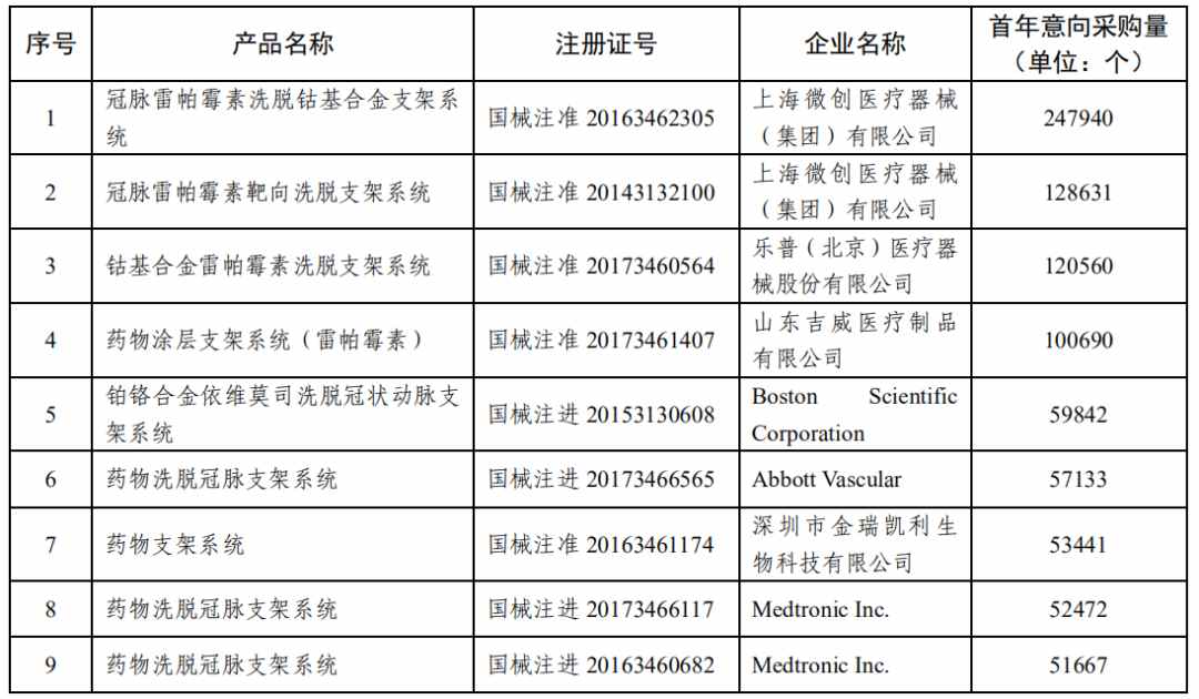 其中,涉及的有微创医疗、乐普医疗、吉威医疗等国内企业,以及波士顿科学、雅培、美敦力等外资企业。其中,微创医疗意向采购量最大,旗下4个品种累计需求共约39万个,占总量约37%;其次波士顿科学占比11%、乐普占比7%。