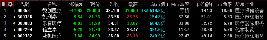 图1:Wind医疗器械指数内61只个股单日市值蒸发近462亿元。来源:Wind