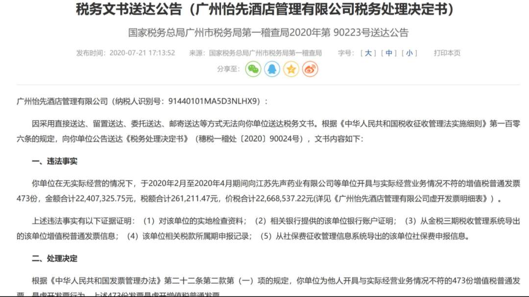 第一则公告显示,怡先酒店在无实际经营的情况下,于2020年2月至2020年4月期间,向江苏先声药业有限公司等单位开具与实际经营业务情况不符的增值税普通发票473份,金额合计2240.73万元,税额合计26.12万元,价税合计2266.85万元。