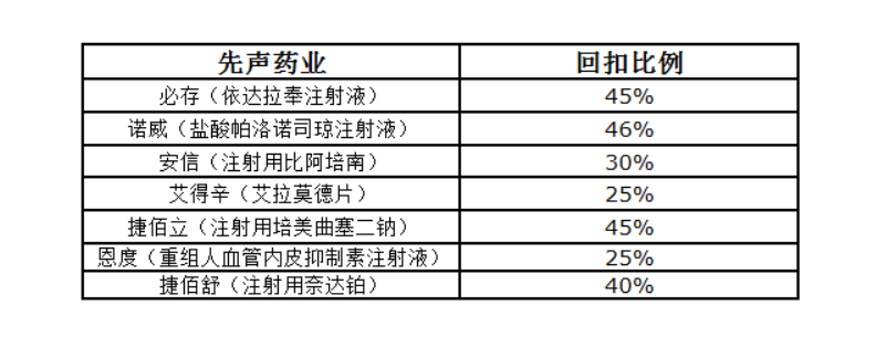 而先声药业7款产品的返点费用率被举报人公之于众,这7款产品分别为必存(依达拉奉注射液)、诺威(盐酸帕洛诺司琼注射液)、安信(注射用比阿培南)、艾得辛(艾拉莫德片)、捷佰立(注射用培美曲塞二钠)、恩度(重组人血管内皮抑制素注射液)、捷佰舒(注射用奈达铂)。其返点费用率分别为45%、30%、25%、45%、45%、25%和40%。