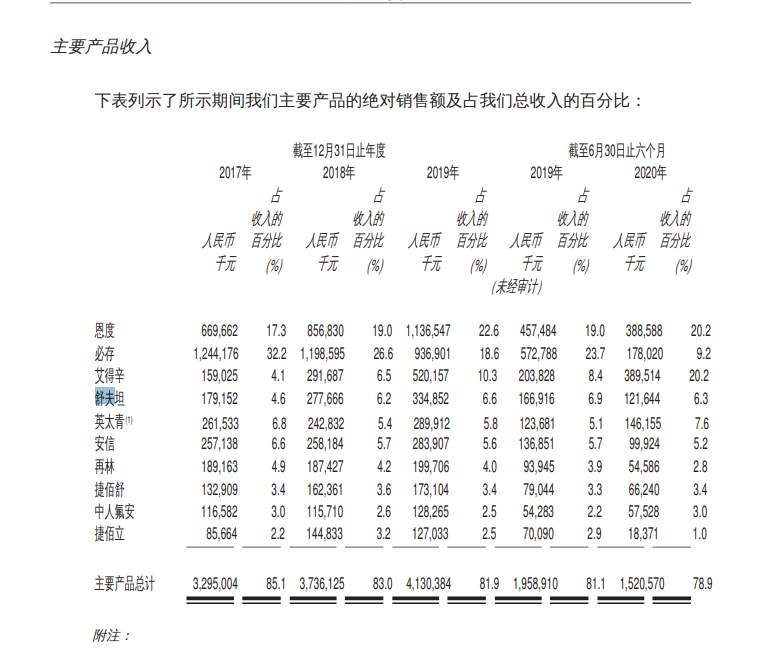据招股书,先声药业的多元化产品组合主要包括10种产品,包括七种仿制药、两种一类创新药以及一种改良型新药。其中,必存、英太青、安信、捷佰舒是首仿药,捷佰立、舒夫坦和再林是仿制药,而恩度和艾得辛是一类新药,中人氟安是改良型新药。截止2017年、2018年、2019年以及截止2020年6月30日止六个月,仿制药主要产品的销售收入分别占总收入的60.7%、54.9%、46.5%及35.5%,而恩度、艾得辛和中人氟安的收入贡献分別占同期总收入的24.4%、28.1%、35.4%和43.4%。