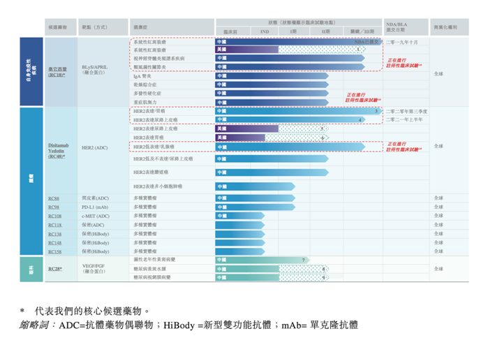 其中新型TACI-Fc融合蛋白泰它西普及新型抗HER2ADC药物DisitamabVedotin(RC48-ADC)现正通过共6项针对不同适应症的注册性临床试验进行评估,两种候选药物均展示出成为同类首创或同类最佳疗法的潜力。