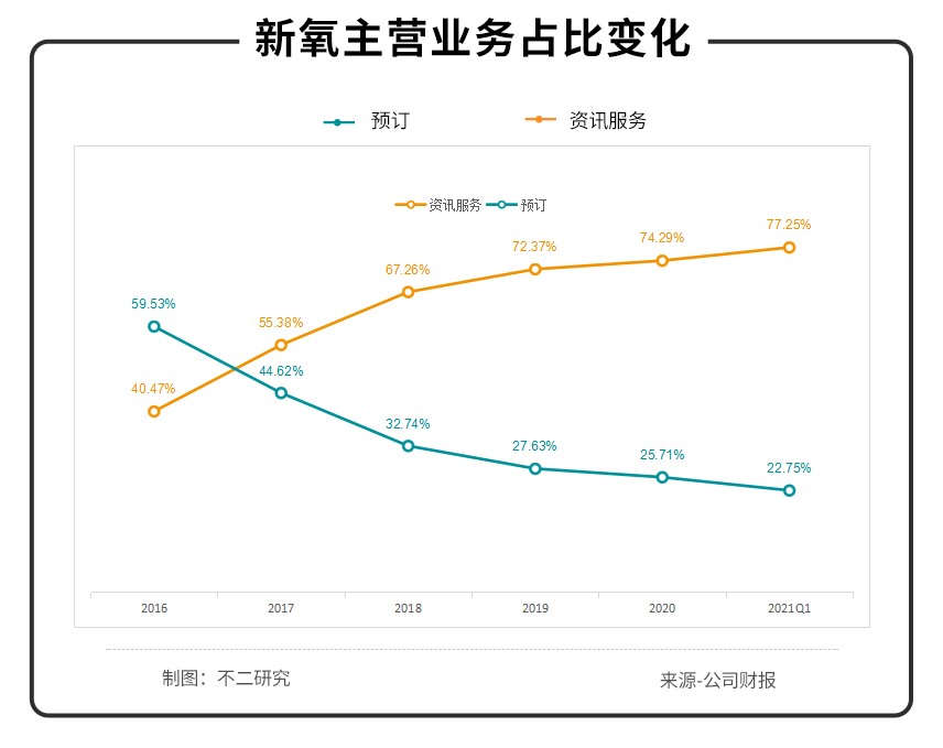 「不二研究」发现,新氧的营收全部来自于资讯服务费和预订服务费,且资讯服务费即商家付的广告费占比越来越高。根据其2021一季报显示,2021年Q1新氧资讯服务费占营收77.25%,这与内容社区的初衷产生背离。