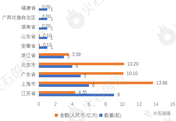 图 2:本周各轮次融资数量及金额来源:火石创造数据库 【融资地域分布】本周融资项目主要分布在江苏省(9起)。从融资金额来看,上海市最为突出,融资金额高达13.66亿元,占总融资金额32.44%。