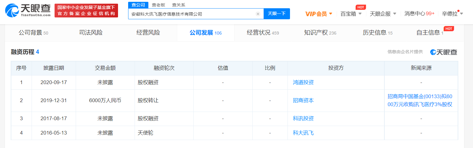 此外,天眼查信息显示,讯飞医疗自成立以来获得了4轮融资,包括科讯投资的加注、鸿道投资的入股等。招商局集团于2019年曾入股讯飞医疗3%,涉资6000万元,讯飞医疗估值约20亿元。