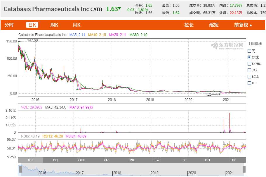 最新消息显示,2020年10月,三期临床实验宣告了该药物的彻底失败,更因为公司几乎将全部赌注都押在了这一款药品上,导致股价目前仅剩2美元/股——从2017年到2021年长达近5年的时间里,公司没有机会翻身。