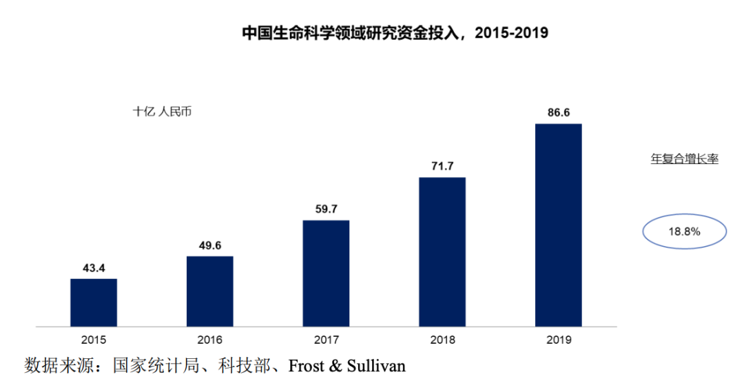 不过,这些风险也并非是无法解决的。放眼望去,生物科学研究依然是国家鼓励扶持的领域。数据显示,中国生命科学领域的研究资金投入迅猛增长,由2015年的434亿元增长至2019年的866亿元。