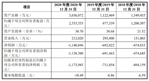 注册稿财务数据显示,百济神州2018年-2020年分别实现营业收入13.10亿元、29.54亿元、21.20亿元;实现归属于母公司所有者的净利润-47.47亿元、-69.15亿元、-113.84亿元。报告期内归母净利润均为负。