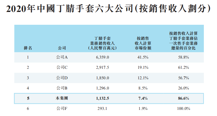泰能医疗的主要产品包括一次性丁腈手套和PVC手套,丁腈手套售价更高,在中国的市场份额为7.4%。据弗若斯特沙利文,按2020年收入计,泰能医疗是中国第五大一次性手套和第五大一次性丁腈手套制造商,并且过半的产品销往北美、欧洲、亚洲及其他大洲的60多个国家和地区,2018至2020年服务的客户数量分别为150、150和450家。