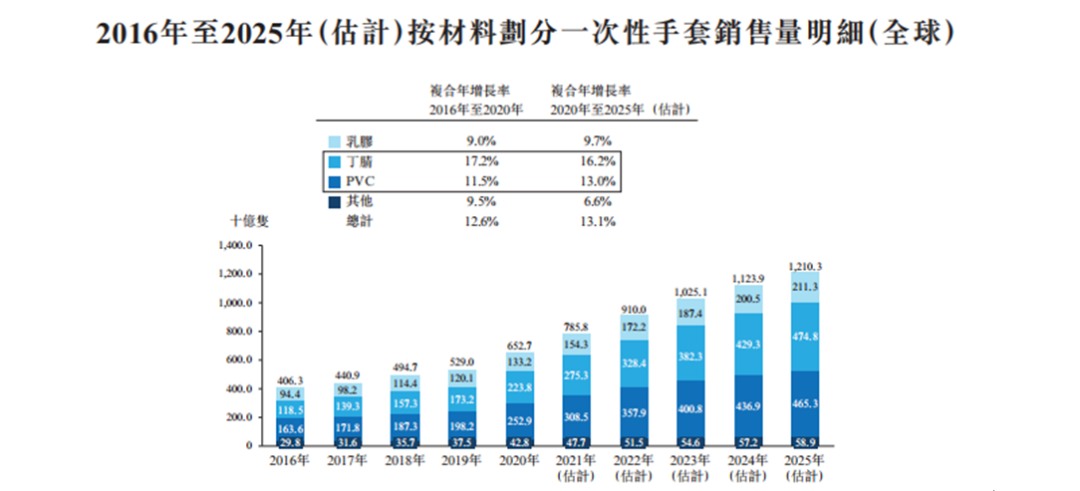 据弗若斯特沙利文数据,从2016年至2020年,丁腈手套的全球销售量从2016年的1,185亿只增长至2020年的2,238亿只,复合年增长率为17.2%,而预计2020年至2025年丁晴手套继续保持高增速,复合年增长率为16.2%。至2020年,丁腈手套的全球一次性手套市场份额(按收入计)最大,约占50.0%。且基于丁腈手套较快的增速,预计2021年市场份额将上升至约54.4%。