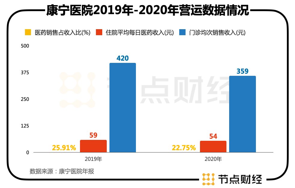 从民生角度而言,药改举措无疑是成功的,但从行业视角来看,两项措施在企业营运数据层面着实显得不够友好,根据康宁医院2020年年报显示,医药销售占收入比从2019年的25.91%下降至22.75%,住院平均每日医药收入由人民币59元下降至54元,门诊均次销售收入从420元压缩到359元。
