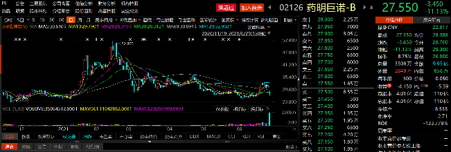 今日早盘,药明巨诺-B股价暴跌。截止发稿,药明巨诺(02126.HK)跌幅为11.13%,报27.55港元,市值110亿港元。