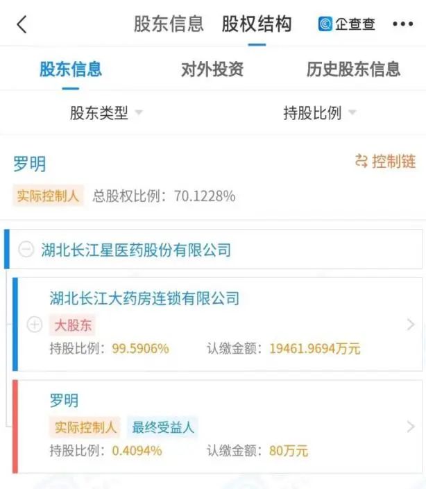 首财君注意到,如今的长江星股权已不再归长药控股所有。企查查信息显示,长江星目前实控人为罗明,其直接持有公司0.4094%股权,通过长江连锁间接持有69.7134%股权。