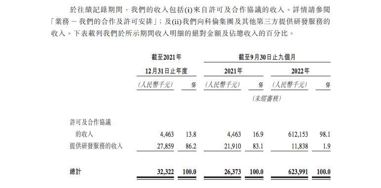 截至2021年12月31日止年度以及截至2021年及2022年9月30日止九个月,科伦博泰来自与默沙东及其他许可伙伴的许可及合作协议分别贡献了总收入的13.9%、17.1%及98.1%。