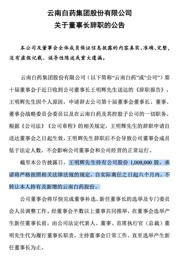 3月6日,云南白药发布公告,称王明辉因个人原因,申请辞去公司第十届董事会董事长、董事、董事会战略委员会委员,以及在云南白药及其控股子公司的一切职务。此时距离王明辉上任董事长,不过仅4个月。