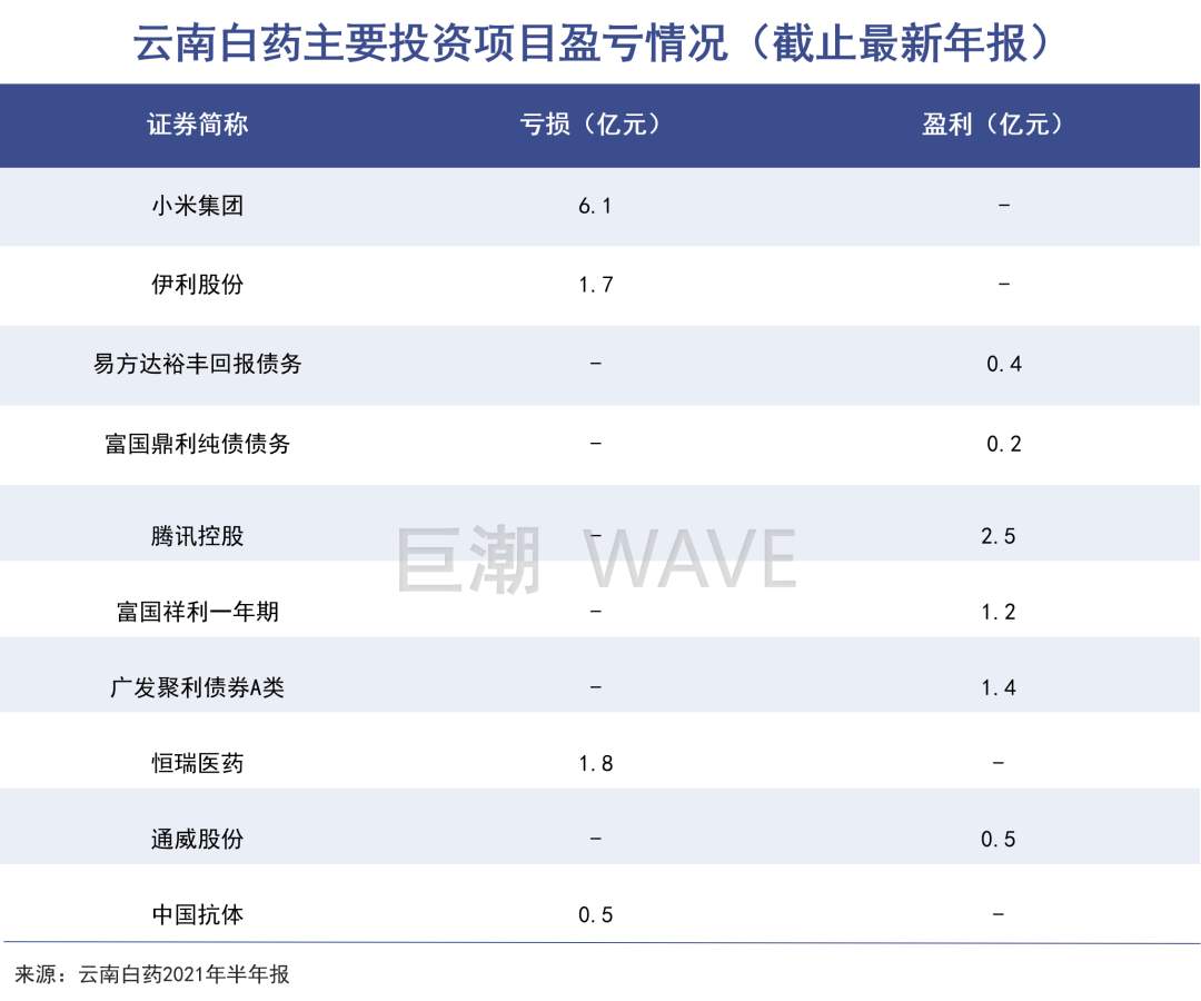 另一方面,云南白药组建了投资执行团队,三年时间内投入约140亿元用于“炒股”,持仓标的除了恒瑞医药、中国生物制药等同行业公司,还有腾讯控股、小米集团、贵州茅台、伊利股份等当年的热门股。