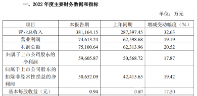 2022年,江中药业实现营业总收入38.12亿元,同比增长32.63%;归属于上市公司股东的净利润为5.96亿元,同比增长17.87%;营业利润为7.46亿元,同比增长19.19%;利润总额为7.51亿元,同比增长20.52%。