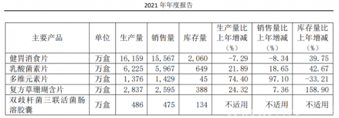 乳酸菌素片是江中药业非处方药中销量排名第二的产品。根据江中药业2021年年报披露,乳酸菌素片一年内销售5967万盒,销量提升18.65%,但早在2015年,乳酸菌素片的销量就达到了3105万盒,6年时间只增长了不到一倍。