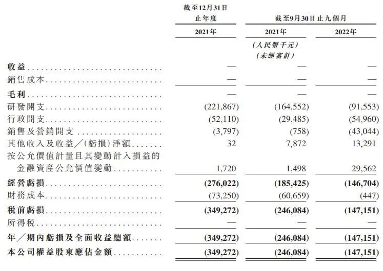 深入到费用支出,2021年、2022年前三季公司研发费开支分别为2.22亿元、9155.3万元;行政开支为5211.0万元、5496.0万元;销售及营销开支分别为379.7万元、4304.4万元。