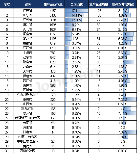 从生产范围来看,可生产Ⅰ类产品企业数量排名前三的省份分别为广东省(4159家)、山东省(3436家)和江苏省(3004家);生产企业增量排名前三的省份为山东省(135家)广东省(125家)和江苏省(72家);从增速来看,重庆市和甘肃省可生产Ⅰ类产品企业增速最大,较2022年底增长7.32%,其次是贵州省7.14%。