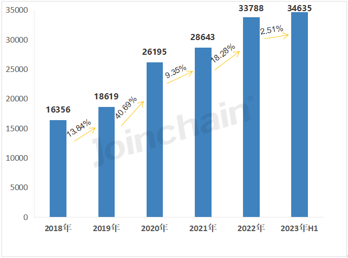 据统计,2023年上半年,全国医疗器械生产企业数量持续增长,截至2023年6月底,全国医疗器械生产企业达34635家,与去年同期相比增长18.45%,新增5394家,较2022年底(33788家)增长2.51%。