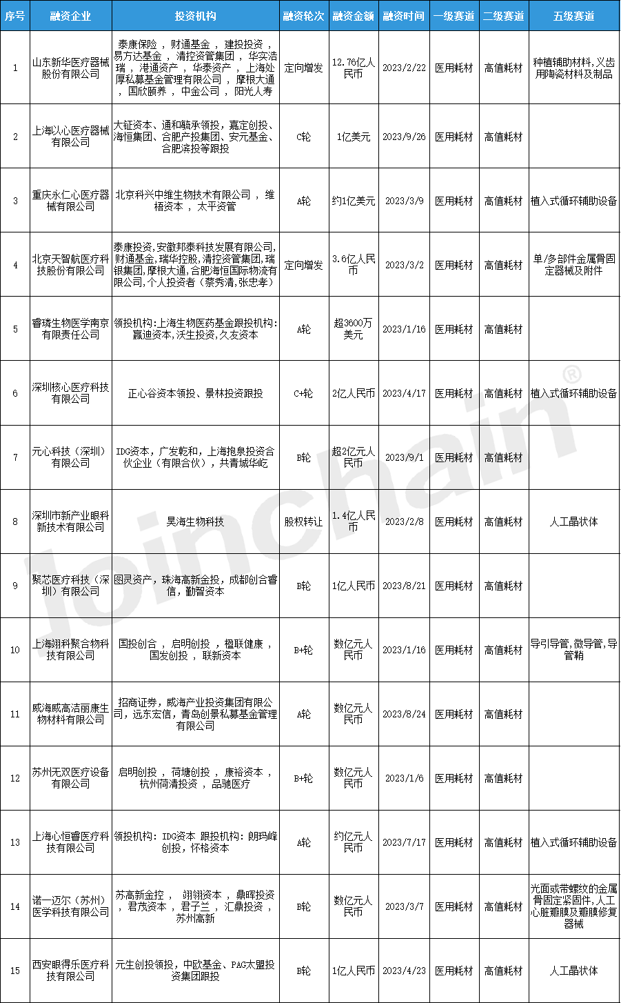 图表5 2023年1-9月高值耗材投融资情况(按融资金额排序)