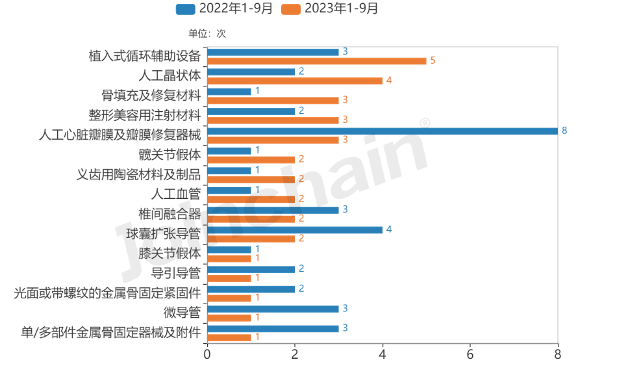 图表3 2022年1-9月 VS 2023年1-9月高值耗材领域各细分领域融资事件(次)