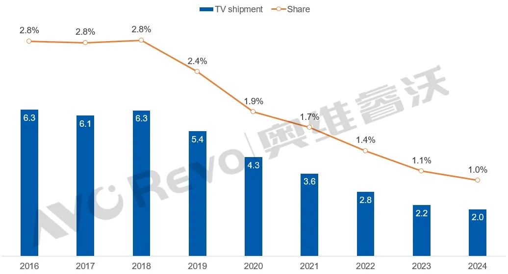 数据显示,松下电视在全球的出货量从2016年的631万台下降到2024年的202万台,全球市占率仅剩下1%。即使在日本本土,松下电视的市场份额也从2018年的16.8%下降到2024年的8.8%,排名第六。