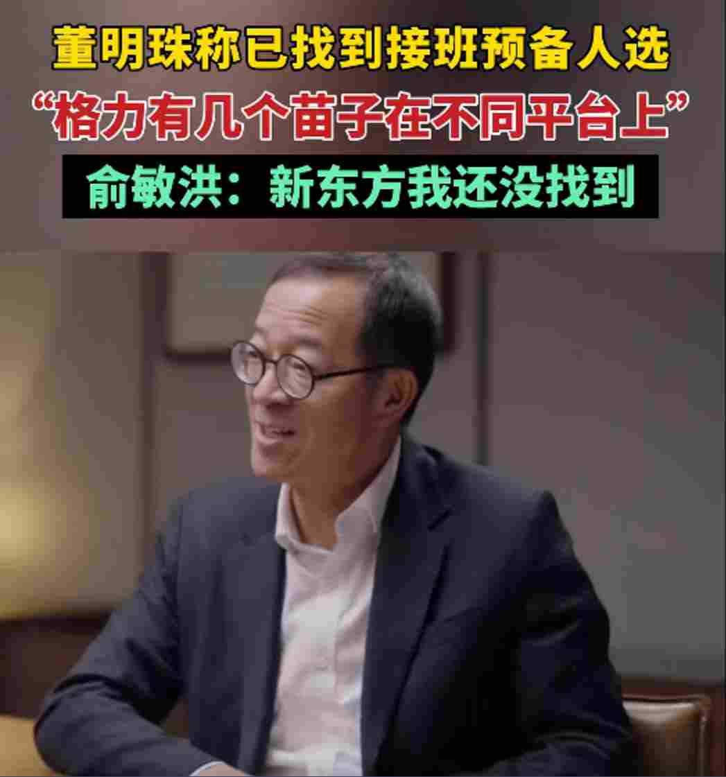 2月20日,《酌见》发布的一段视频引发广泛关注,视频为董明珠和俞敏洪的对话,董明珠说已经找到三四个备选接班人,而俞敏洪则表示了羡慕,称新东方目前还没有找到接班人。董明珠则表示自己已经找了几个苗子,在不同的平台和不同的岗位,并称关键要有一个人出来。
