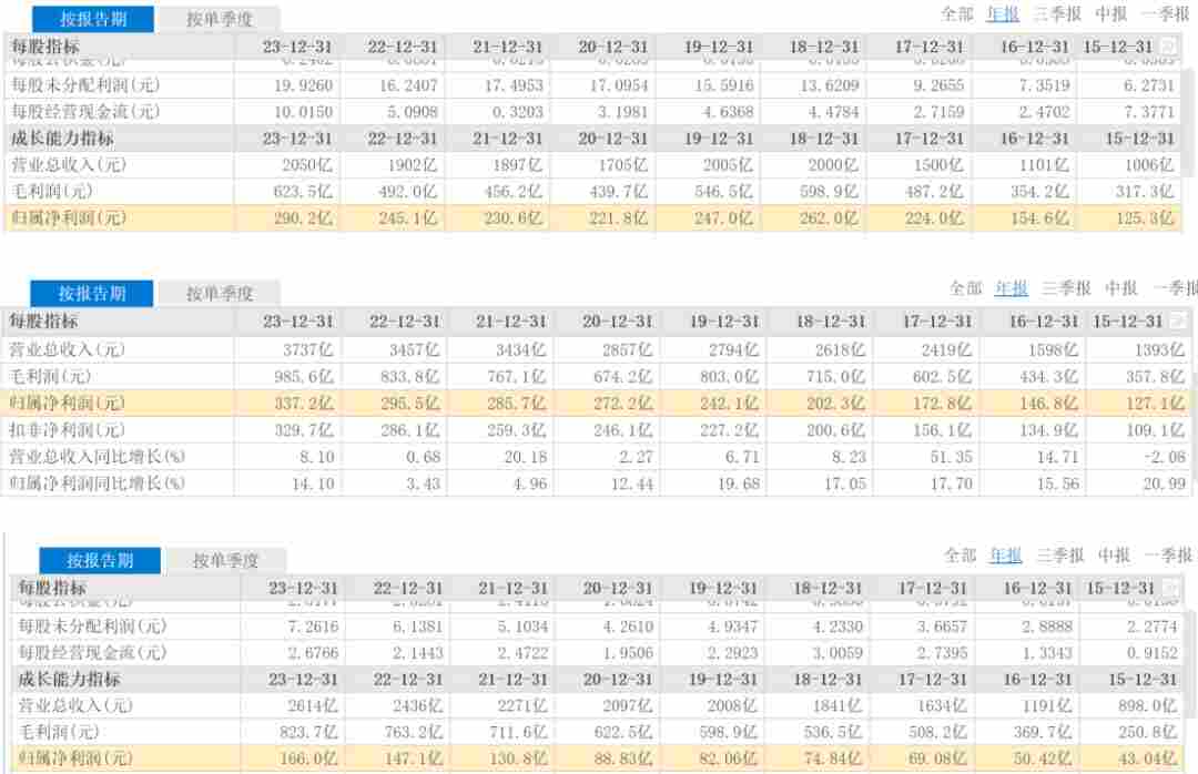 海尔智家此前一直是三强中的末位,在2019年以前,海尔营收一直是三强中垫底,甚至净利润也只有美的和格力的三分之一左右。但在2019年海尔营收完成了对格力的反超,这一年海尔营收2008亿元,格力营收2005亿元。截至2023年,格力营收2050亿元,美的营收3737亿元,海尔营收2614亿元,格力“逆袭”成三强中的末位。